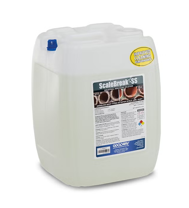 Goodway® ScaleBreak-SS is een uniek reinigingsmiddel, speciaal ontwikkeld voor gebruik op roestvrijstalen apparatuur, warmtewisselaars en vele andere technische systemen. Het verwijdert effectief afzettingen zoals kalkaanslag, roest en struviet. De basiscomponenten van ScaleBreak-SS zijn veilig voor langdurige blootstelling aan roestvrij staal en elimineert het lange termijn potentieel van waterstofbrosheid.
