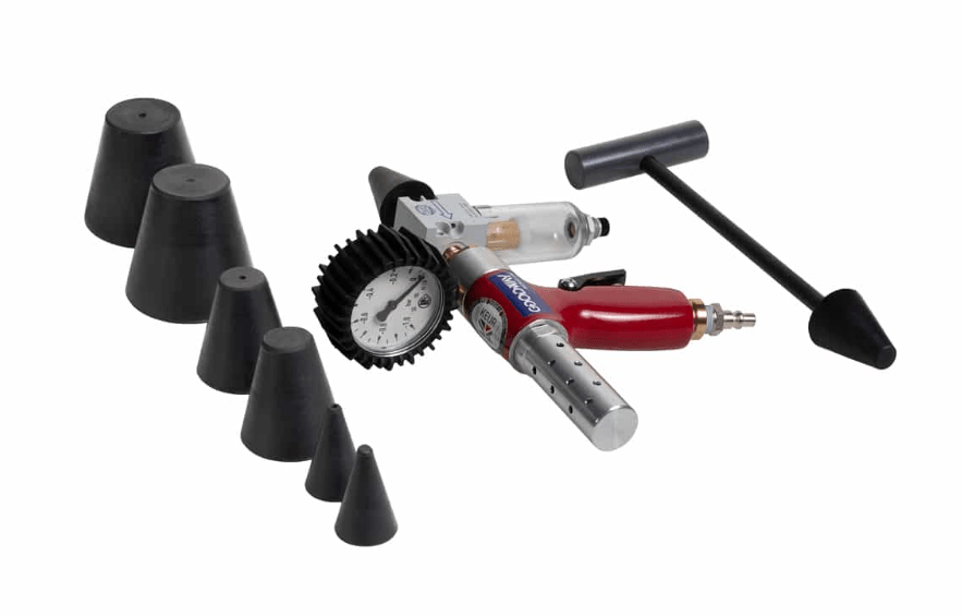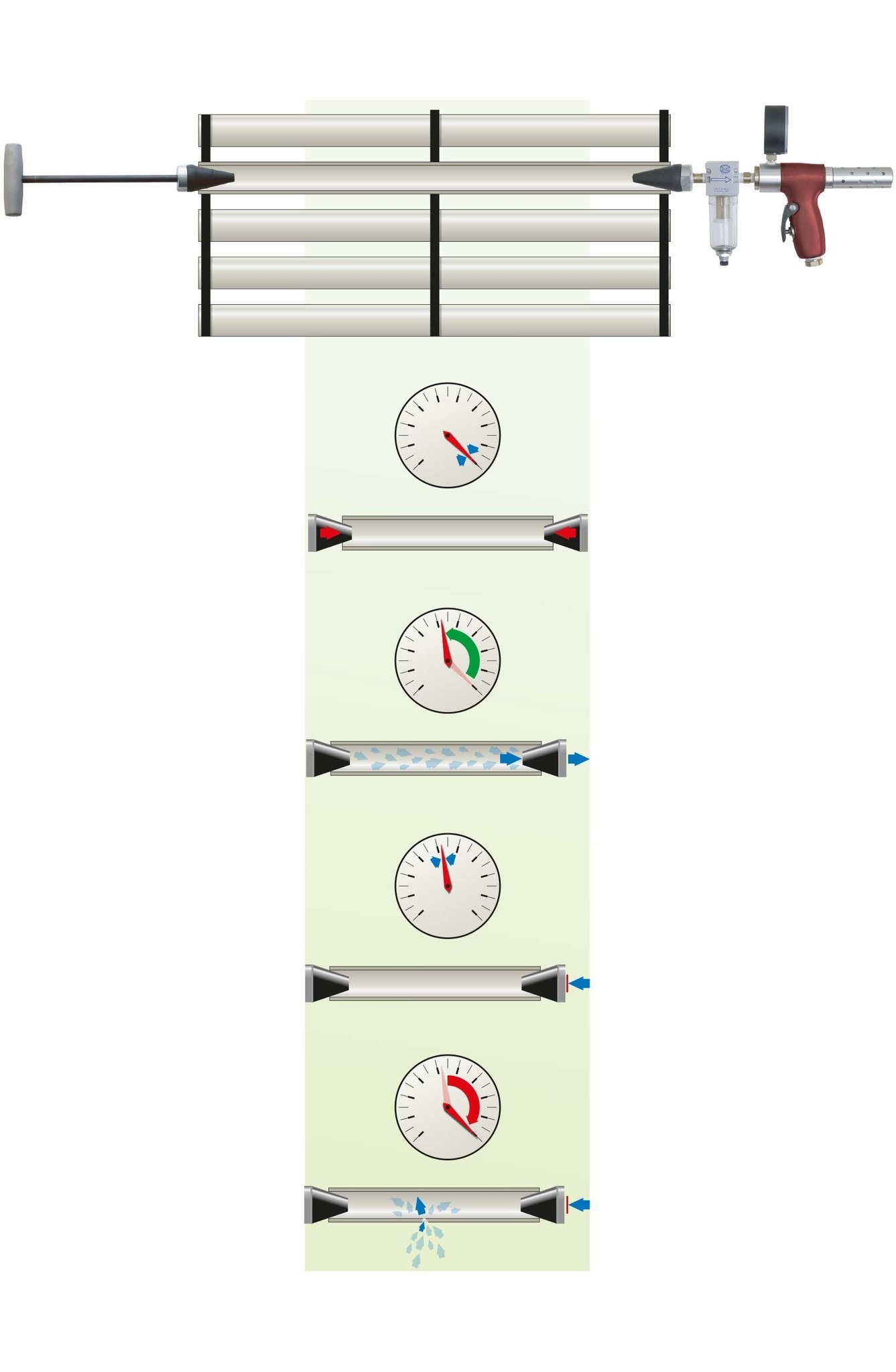De VAC-1000 is eenvoudig en efficiënt in gebruik. Het apparaat wordt aan één uiteinde van de pijp ingebracht met behulp van een conische nozzle, terwijl het andere uiteinde wordt afgesloten met een T-stuk en een identieke gesloten nozzle, waardoor een volledige afdichting ontstaat. Eenmaal aangesloten op perslucht, genereert het systeem een vacuüm in de pijp, dat kan worden gecontroleerd op een meter. Een stabiele meting geeft aan dat de pijp lekvrij is, terwijl een daling in de meterstand de aanwezigheid van een lek bevestigt.