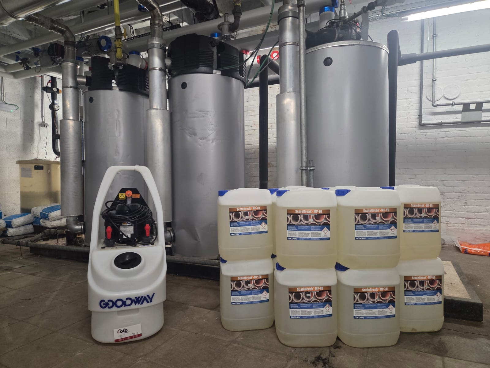 Het Goodway Benelux team leverde hun GDS-C92-FWF ontkalkingspompsysteem in combinatie met Goodway® ScaleBreak-MP ontkalkingsoplossing om de kalkafzetting in deze ketels effectief te verwijderen. Deze krachtige combinatie stelde de klant in staat om elk systeem grondig en veilig te reinigen, waardoor de prestaties in relatief korte tijd weer bijna optimaal werden.