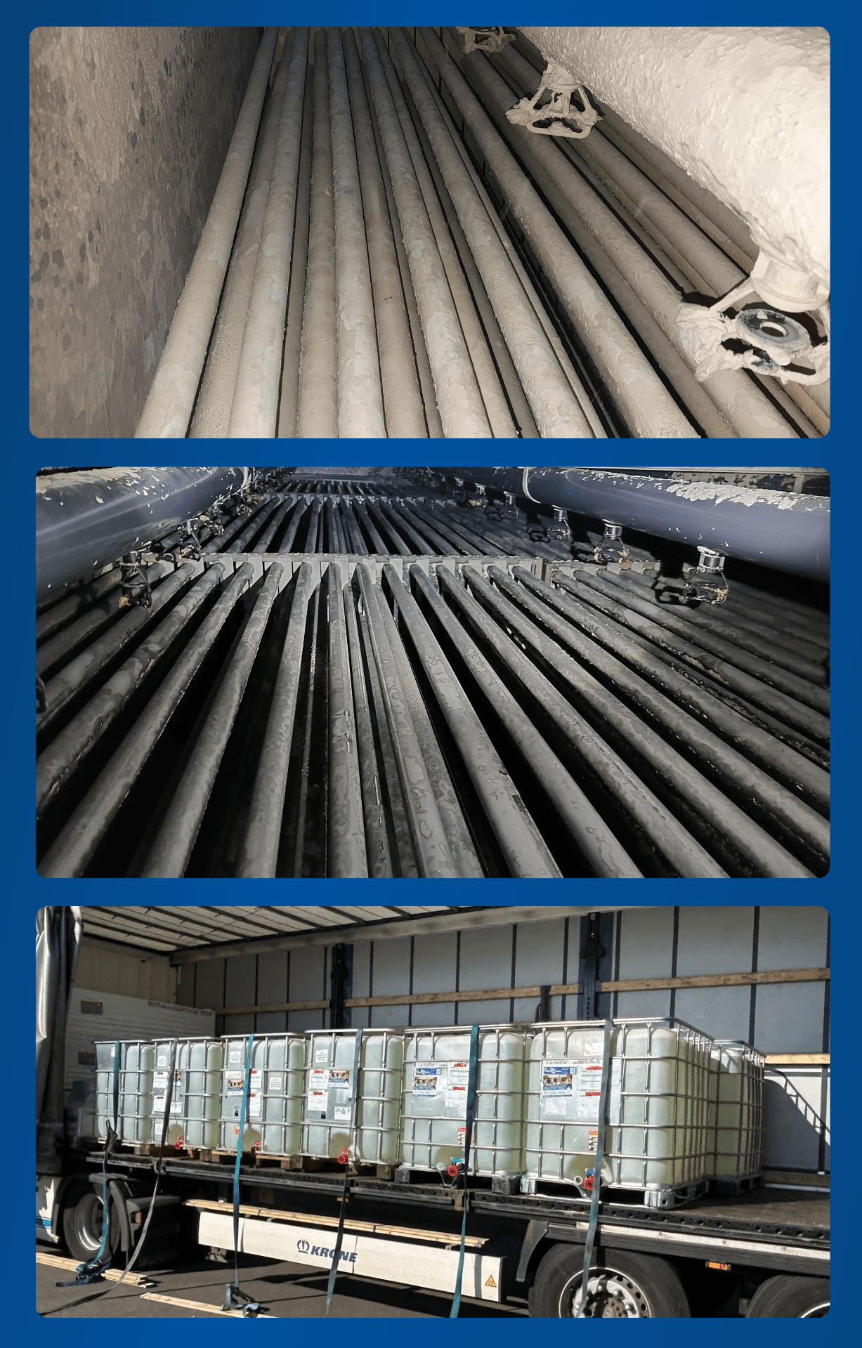 Vanwege de extreme mate van vervuiling moest de reiniging in meerdere fasen worden uitgevoerd, met langere circulatietijden om de harde, gelaagde kalk af te breken. Aan het einde van het project waren in totaal negentien (19) IBC-containers van 1000 liter ScaleBreak-MP gebruikt om de pijpen weer in bijna originele staat te brengen – zonder schade te veroorzaken aan de gegalvaniseerde stalen bundels of andere kritieke condensoronderdelen.