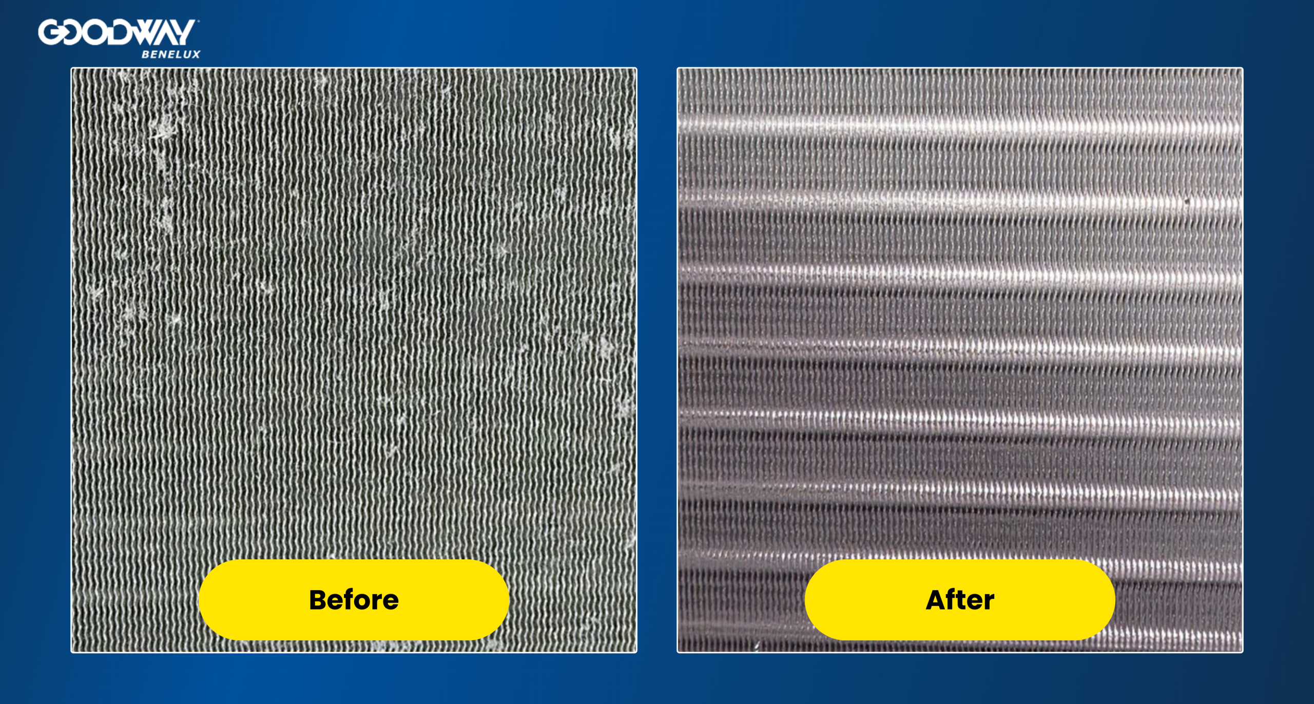 Het schoonhouden van de lamellen van luchtbehandelingskasten is van cruciaal belang om een zeer efficiënt systeem te behouden. Goodway Benelux biedt speciale (lagedruk) reinigingsapparatuur die veilig kan worden gebruikt om afzettingen op de lamellen te verwijderen. Door een speciaal reinigingsproduct toe te voegen, kunnen de lamellen zelfs worden ontvet, wat tot nog betere reinigingsresultaten leidt.